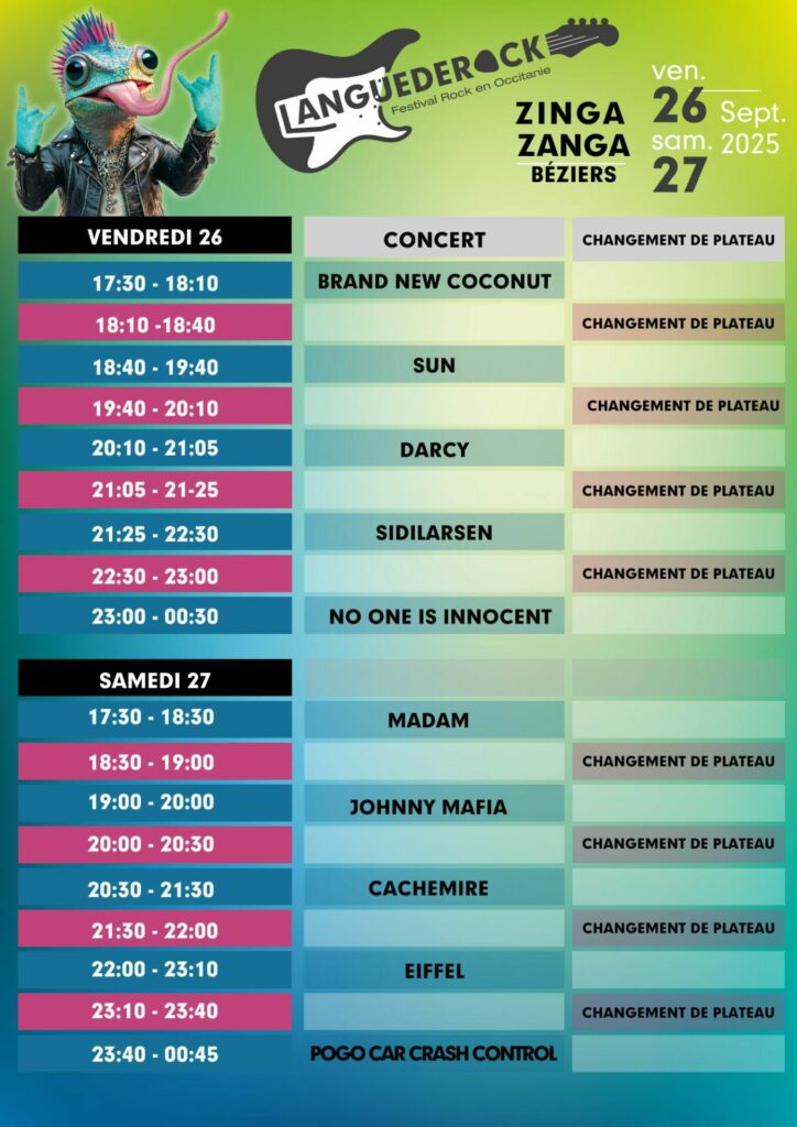 NO ONE IS INNOCENT EIFFEL POGO CAR CRASH CONTROL CACHEMIRE SIDILARSEN SUN JOHNNY MAFIA MADAM DARCY BRAND NEW CØCØNUT Billetterie PASS 1 JOURDEBOUT RESERVER PASS 1 JOURASSIS RESERVER PASS JEUNES12 – 16 ans RESERVER PAS 2 JOURSDEBOUT RESERVER PASS 2 JOURSASSIS RESERVER DORMIRCampings, hôtels à proximité MANGERBars et Food truck sur place au Festival VENIRAccés, mobilité et lieu du festival FAQInfos essentielles : PMR, .. NOS PARTENAIRES 2025